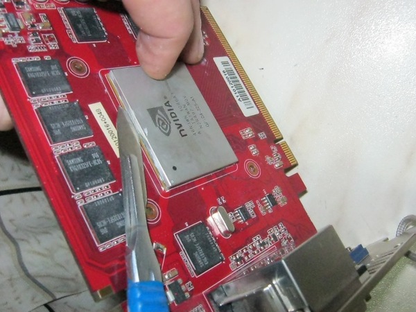 Далее - при желании махнуть соточку за праздник, и, не трясущимися руками, греем крышку видеочипа. В интернетах греют градусов до 100, я грел "по наитию" - ну, примерно как сенсоры при переклейке (есть богатый опыт). Затем находим уголок под крышечкой, и туда - лезвие первое. Опять греем. чуть продвигаем лезвие. Главное вставить его не между самой BGA и текстолитом платы, а именно между крышкой и BGA.