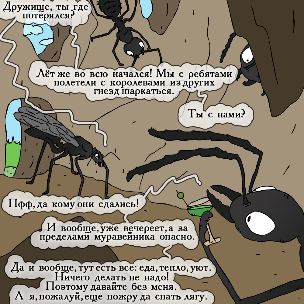 Факт-пояснение: Крылатых самцов (королей) семья выводит исключительно для ежегодного лёта. Самцы, как правило, абсолютно ничем не заняты в муравейнике: они лишь выпрашивают еду и слоняются без дела. Когда наступает момент покинуть муравейник, молодые короли и королевы улетают. Но бывают и те, кто вопреки всему остаются. Увы, судьба у них незавидна: они будут убиты и вынесены на мусорку, т.к. никому не нужны дармоеды.