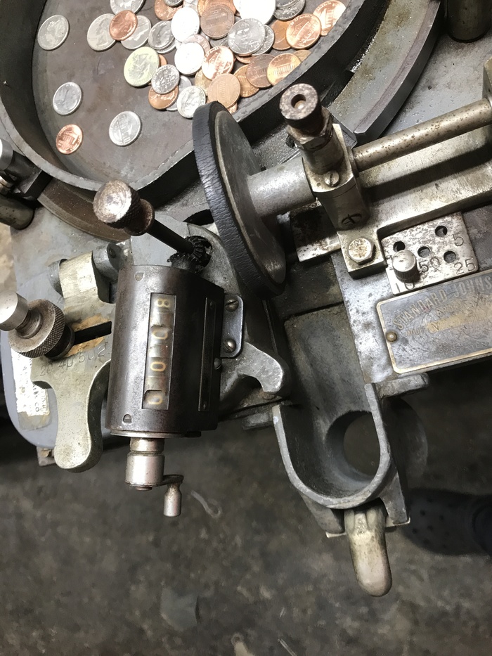 Ручкой справа крутишь барабан, и монеты под воздействием центробежной силы, выбрасываются через щель регулируемой длинны, под разный номинал монет: