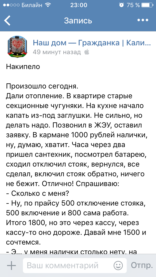 Дали отопление. В квартире старые секционные чугуняки. На кухне начало капать из-под заглушки. Не сильно, но делать надо. Позвонил в ЖЭУ, оставил заявку. В кармане 1000 рублей налички, ну, думаю, хватит. Часа через два пришел сантехник, посмотрел батарею, сходил отключил стояк, вернулся, все сделал, включил стояк обратно, ничего не бежит. Отлично! Спрашиваю: