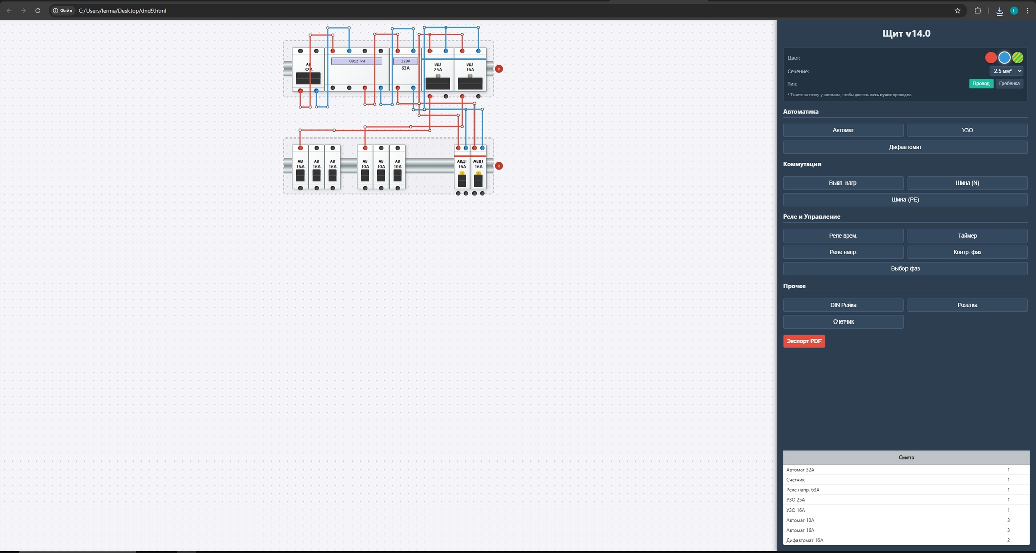 *скрин месячной давности. Сейчас добавлены новые модули, потребители, "ввод", логика для проверки, расчёт нагрузки на фазы и возможность сохранения проектов.