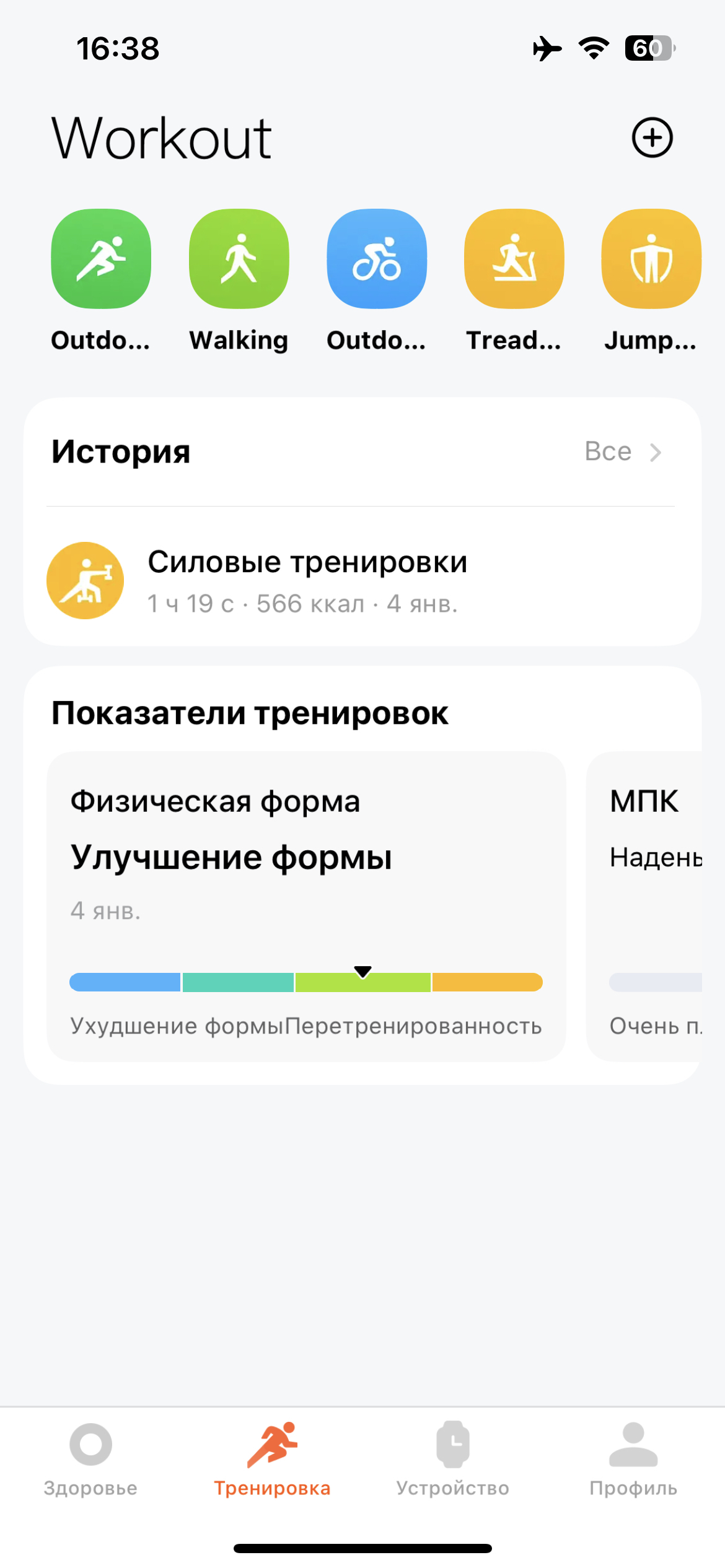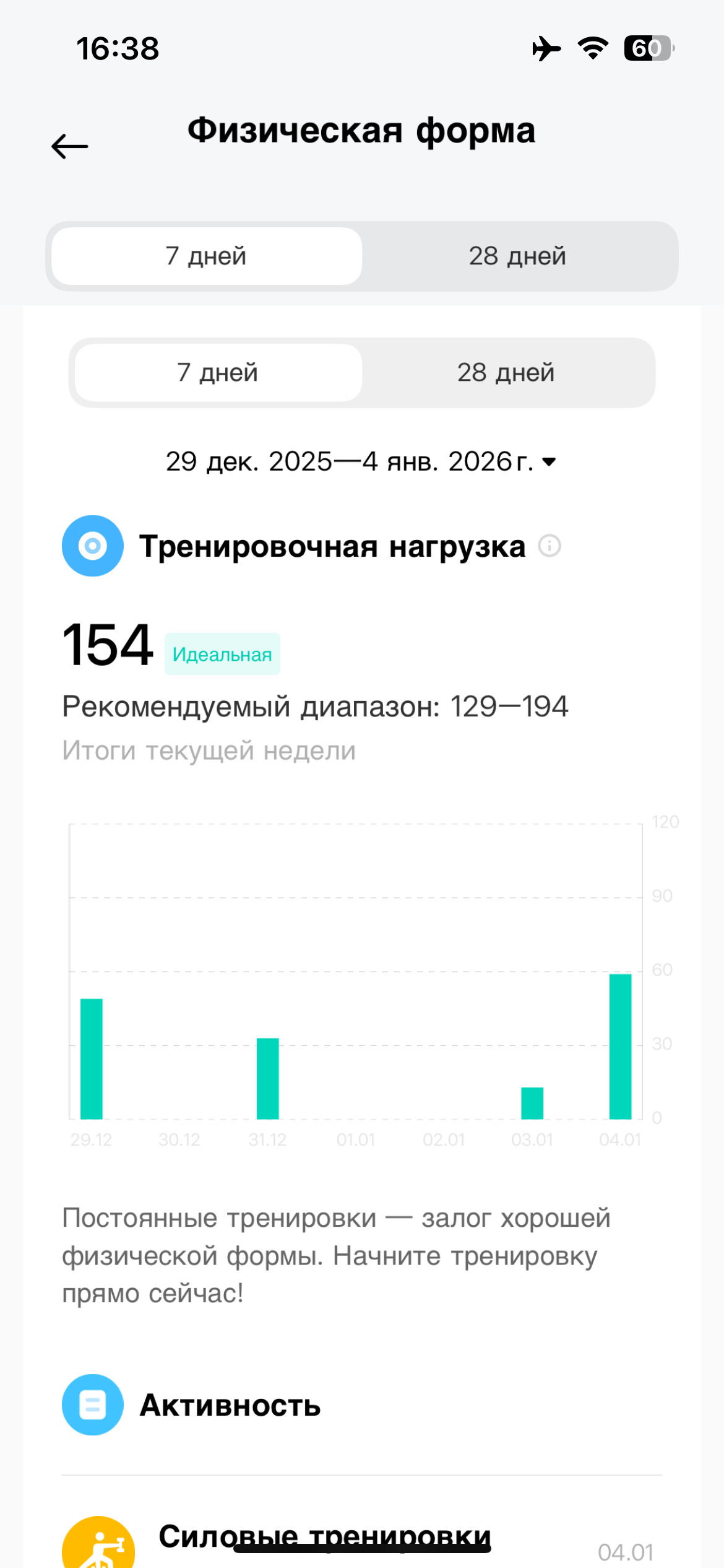К слову, сегодня я снова в голубой зоне, а название плашки сменилось с «физической формы» на «тренировочную нагрузку». Так и не понял, как это работает, приложение полно непонятных чудес.