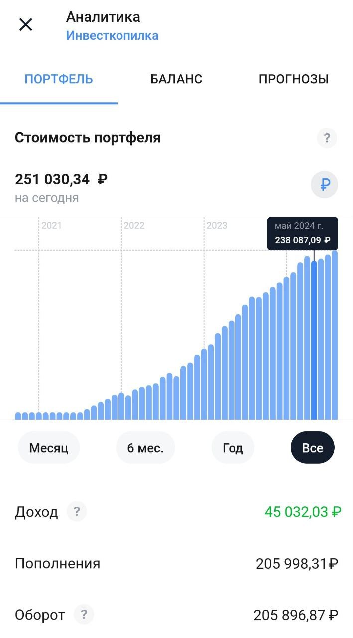 Это мой самый старый эксперимент, который запустил в ковидном 2020 году. Все началось с одного стаканчика кофе, а теперь на счету более 250 000 руб. Четверть миллиона!