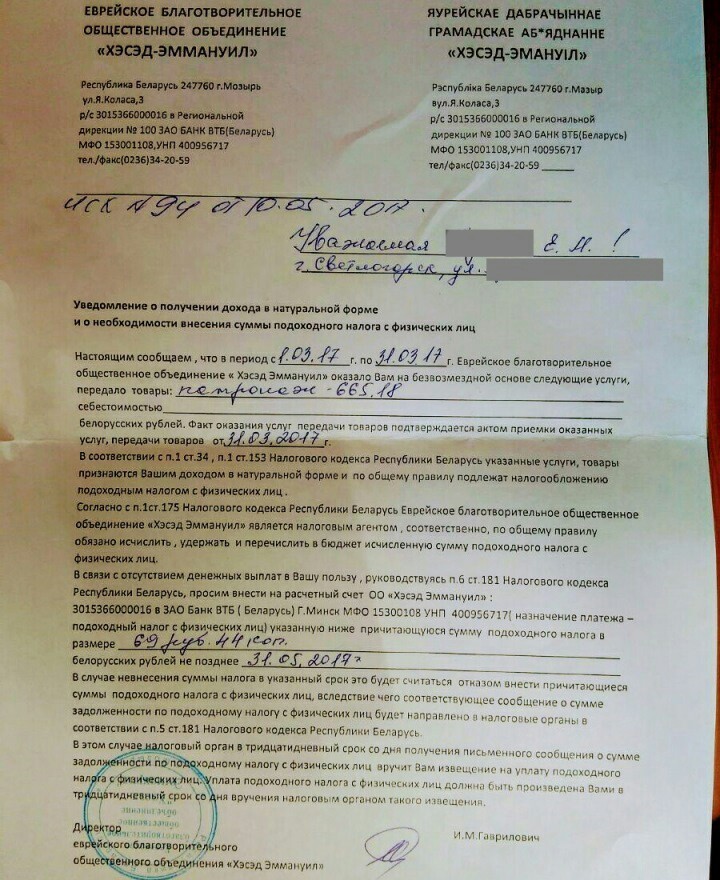 Тысячи еврейских стариков Республики Беларусь — реципиенты гуманитарной помощи от американского JDC («Джойнта»), недавно получили уведомления о необходимости заплатить подоходный налог со стоимости тех благотворительных услуг, которые им были оказаны по линии «Хеседов» — региональных отделений «Джойнта» по оказанию помощи нуждающимся евреям.