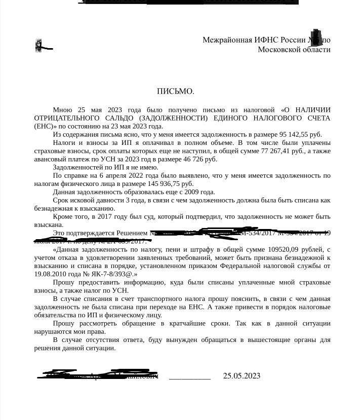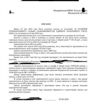 Здравствуйте, помогите разобраться что происходит. в 2008-10 года владел мощным автомобилем, за 2,5 года оплачивал налог по 40к в год. Все шло своим чередом но потом мне стали поступать письма о налоговой задолженности по этой авто. Я сходил пару раз, относил чеки об уплате из ныне покойного банка Пушкино (умер в 13 года) и меня отпускали с миром. Но в 2017 году налоговая подает на меня в суд, я пообщался с юристом и он сказал даже не ходить, за давностью спишут. Ну так и произошло. Суд признал что налоговая не права и исковая давность. Жизнь идет своим чередом задолженность нигде не отражается, плачу налоги как ИП и как частное лицо за собственность. И вот наступает 23 год. Я заплатил по УСН налоги и тут происходит ВАУ, с моих платежей ИП списывают долги ЧЛ которые даже суд признал в 17 году не действительными (еще была какая-то амнистия), сейчас на мне висит требование от налоговой о просрочке платежа 94к и начислении пеней, + во всех приложениях банков выскочило требование 57513р + это как от ЧЛ, и 83000 на ИП.... Бухгалтерию ведет Тинькоф, там бухгалтер сказал пока ждать ответа из налоговой по платежам у них все сходится, но каждый день что-то опять и опять прилетает как на ЧЛ так и на ИП, я уже с ума схожу. Что делать? посоветуете?