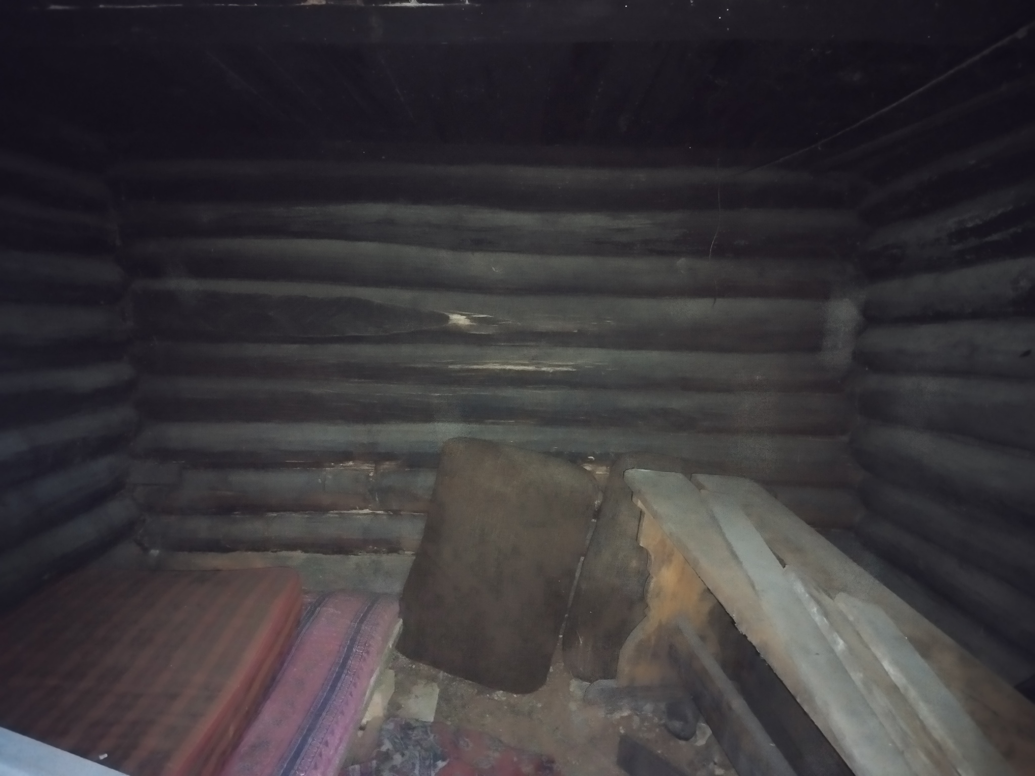 Закопчённый потолок показывает насколько сильно коптила печь. На полу остатки сломанной кирпичной печки.