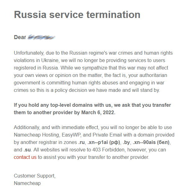 - домены должны удалить только резиденты России. Мера не будет касаться тех, кто помогает против режима (так в письме), а так же не-резидентов