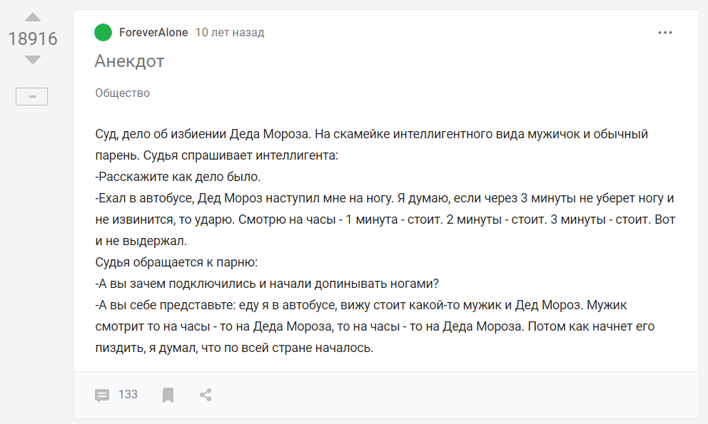 Тоже аномально много лайков, но суть не в этом. Это то самое заявленное во Введении расследование. Перечитав этот анекдот, я понял, что что-то тут не сходится. Знаю две версии, ни в одной не было ничего про Деда Мороза, да и звучит как-то абсурдно и не смешно. А главное - не злободневно.