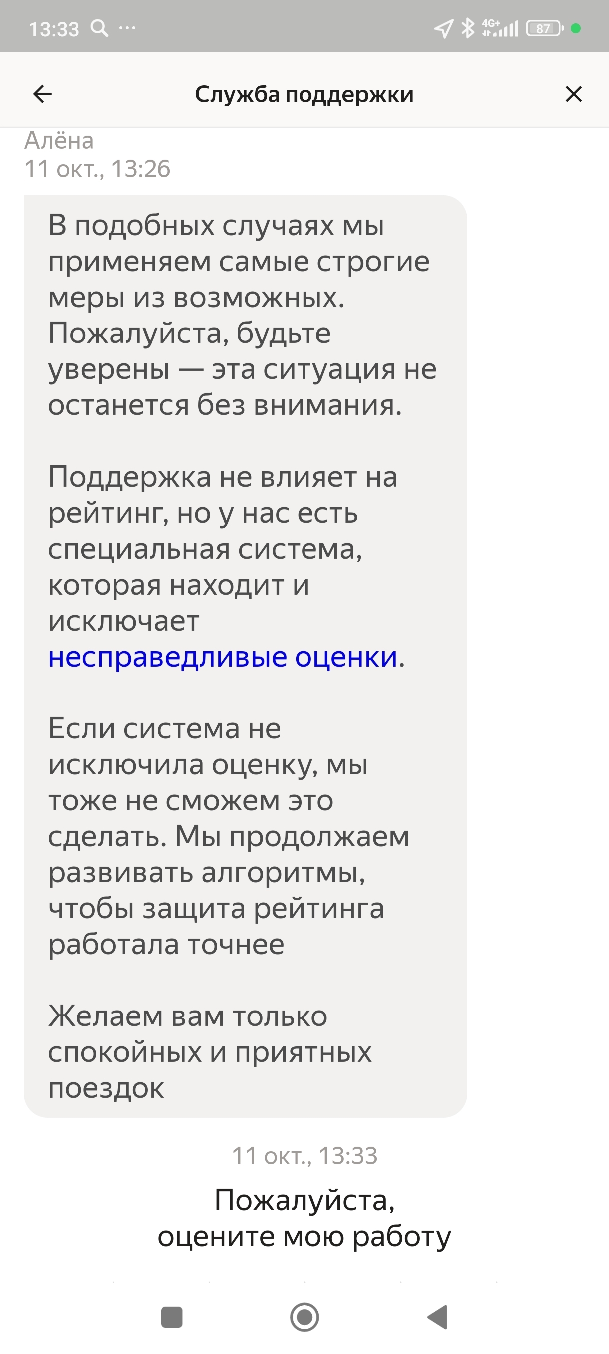 "Кол" от пассажира прошёл, поддержка его удалить не сможет, кол мне исправлять месяца два теперь (пониженный рейтинг, потеря 4-ёх баллов приоритета).