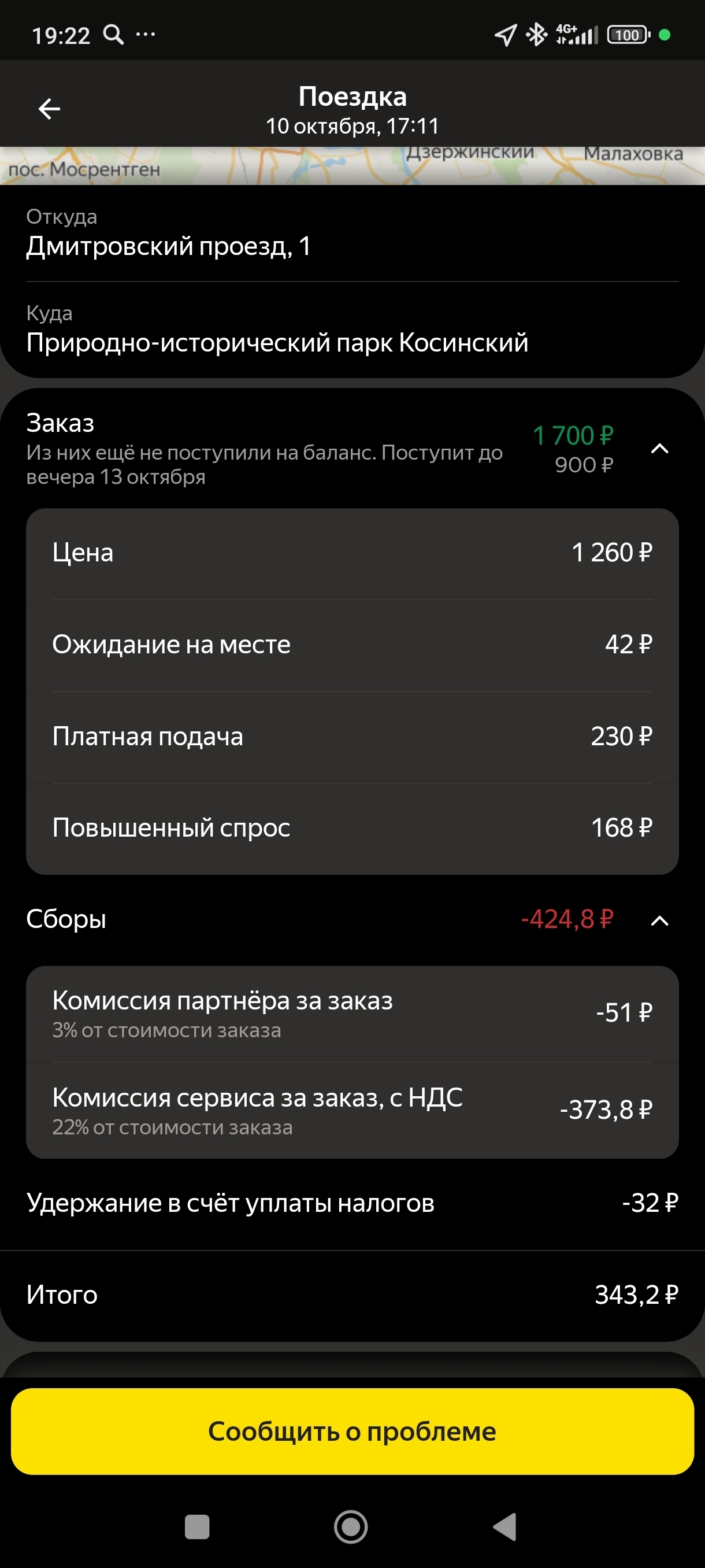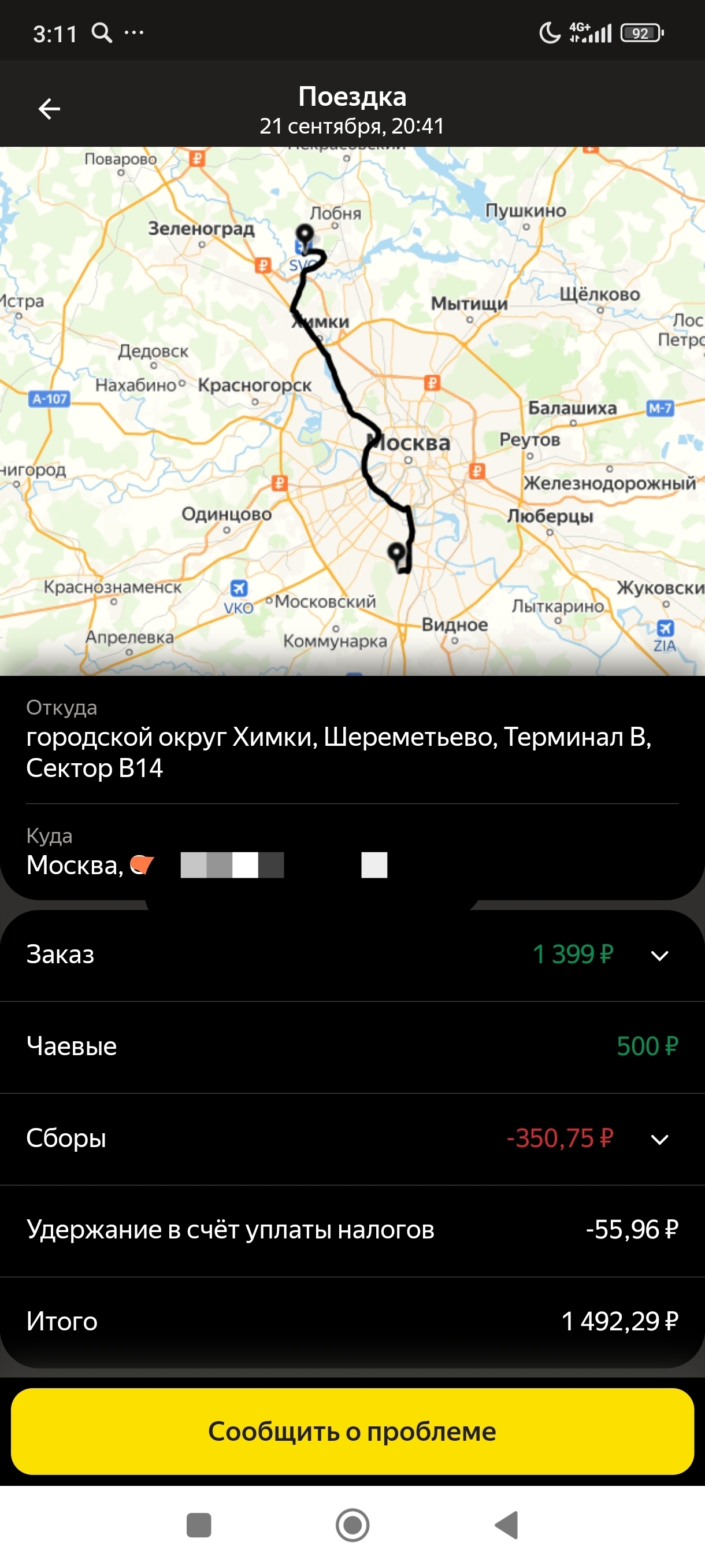 Обращаю внимание (своё), что конечная точка где то в центре лесного массива под Балашихой. Немного напрягает, но подвоха не чувствую. Как понимаю, их цель максимально растянуть поездку, конечная точка может быть где угодно, главное, что бы подальше от места посадки, но не слишком подозрительно далёкой.