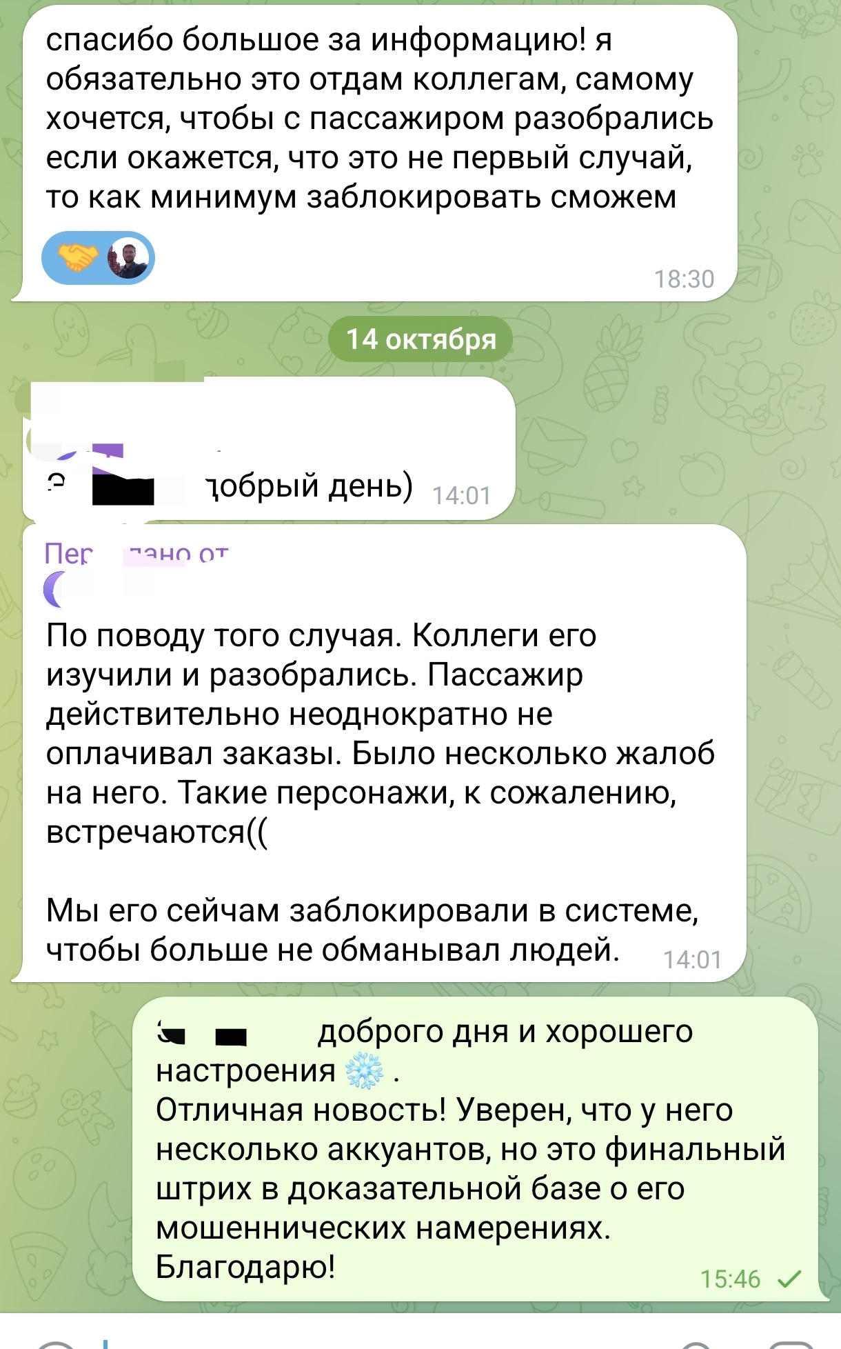 В начале поездки мужчина просит мой телефон позвонить по делам, так как на его "мобиле" "нет денег". Смотрите скриншоты, по факту он докладывал корешу о своих "успехах". Да, телефон дал зря, понимаю.