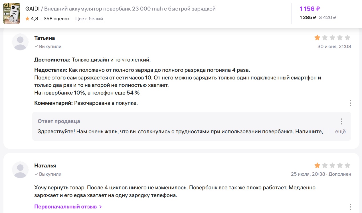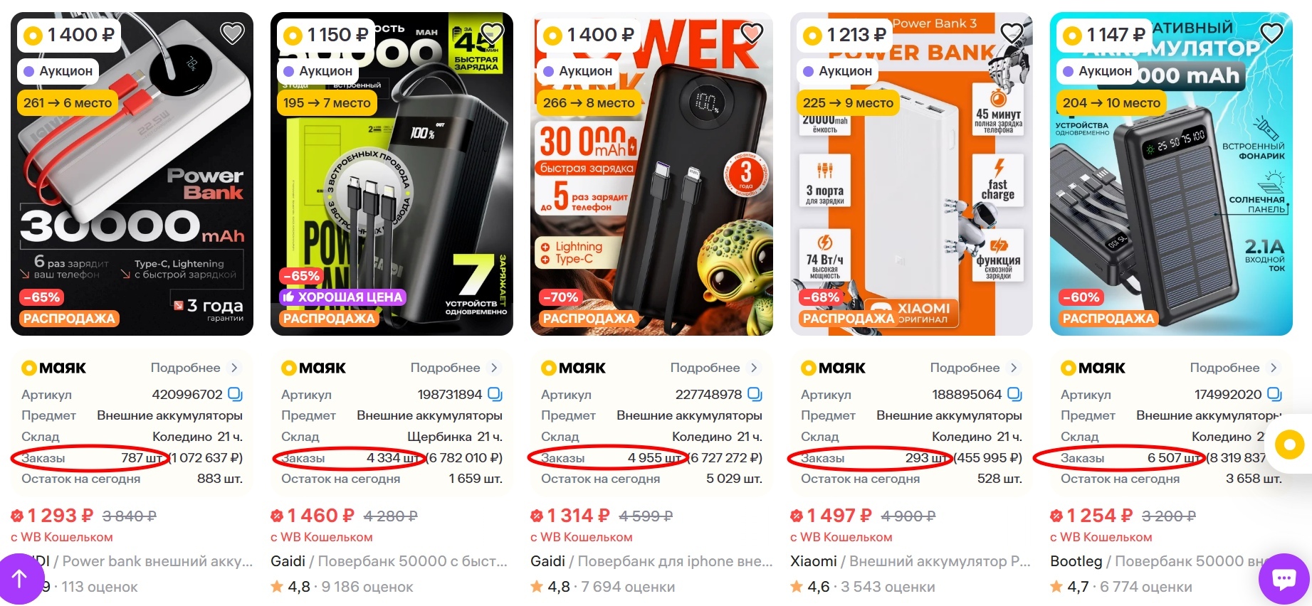 Например, если в поиске набрать «внешний аккумулятор», то в первой сотне на WB мне вываливается 54 фейка, на Ozon – 28. Если сделать сортировку по цене, то фейков становится уже ~80-90%. А если добавить к запросу, например, цифру «50000», то фейков на WB будет ровно 99 из 100.