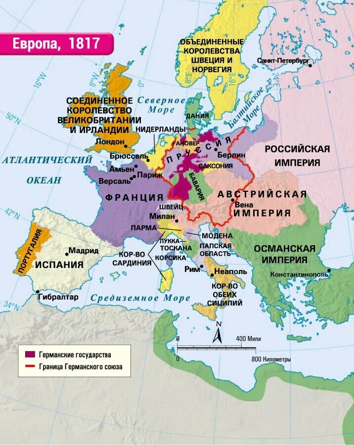 На состоявшимся после Наполеоновских войн Венском конгрессе страны победительницы определили новые границы Европы. Франция была лишена всех завоеванных территорий и возвращена к границам 1792 года. В освобожденных Италии и Германии было принято решение сохранить феодальную раздробленность, в результате чего на территории Германии в дальнейшем функционировали 34 независимых государства и 4 вольных города, а в Италии 6 государств. Ломбардия и Венеция вернулись под контроль Австрийской Империи. Российской империи, чей вклад в победу над французами был наиболее весовым, была передана часть созданного Наполеоном герцогства Варшавского, а российский император Александр I становился польским царём. Также западными странами было признано присоединение к России Финляндии, которое фактически состоялось еще в 1809 году. Западные земли Великой Польши с городом Познань и польское Поморье возвращались Пруссии. Также на конгрессе состоялось международное признание нейтралитета Швейцарии, что позволило ей в будущем не только уберечь свою территорию от двух мировых войн, но и стимулировать развитие экономики поддержанием взаимовыгодного сотрудничества с воюющими сторонами. Что касается еще одной страны победительницы - Англии, то за ней остались захваченные в ходе войны бывшие голландские (провинции в Южной Африке, остров Цейлон и др. ), французские (остров Мальта, Сейшельские острова и др. ), а также некоторые испанские и португальские колонии.