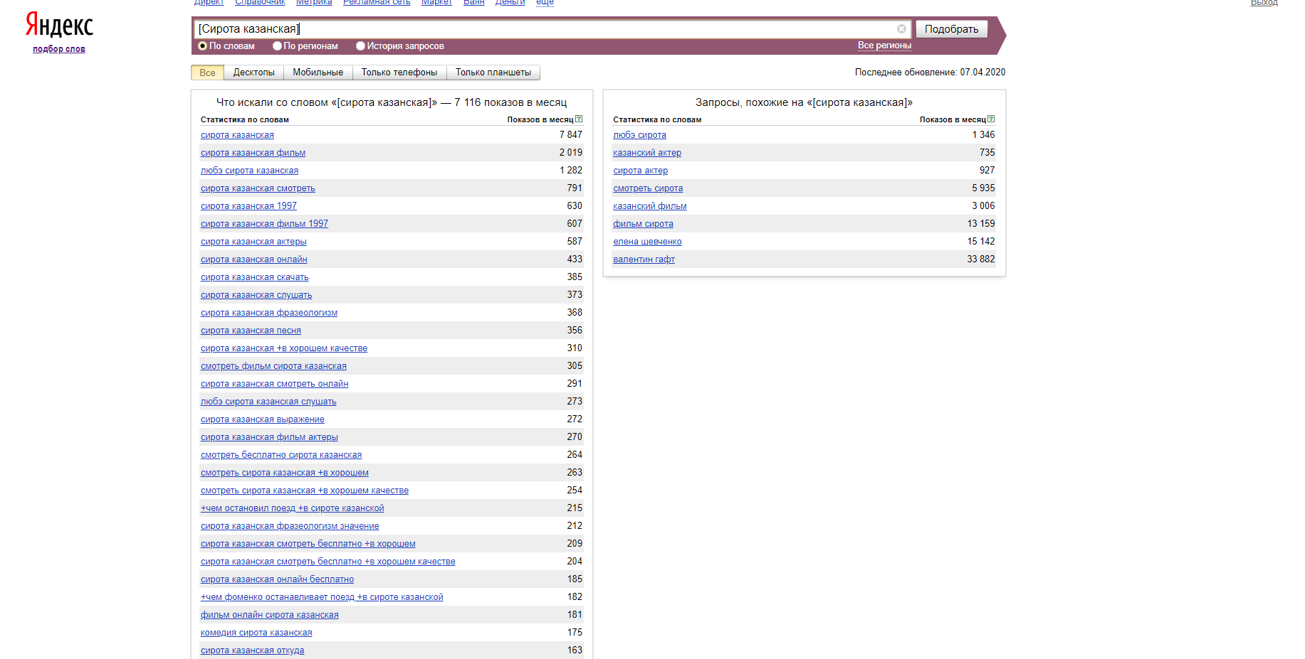 Зачем это нужно? Когда вы что-то забиваете в Вордстате, система выдает вам все подряд. И ключ "Сирота казанская", который искали 7 847 раз за месяц, будет включать