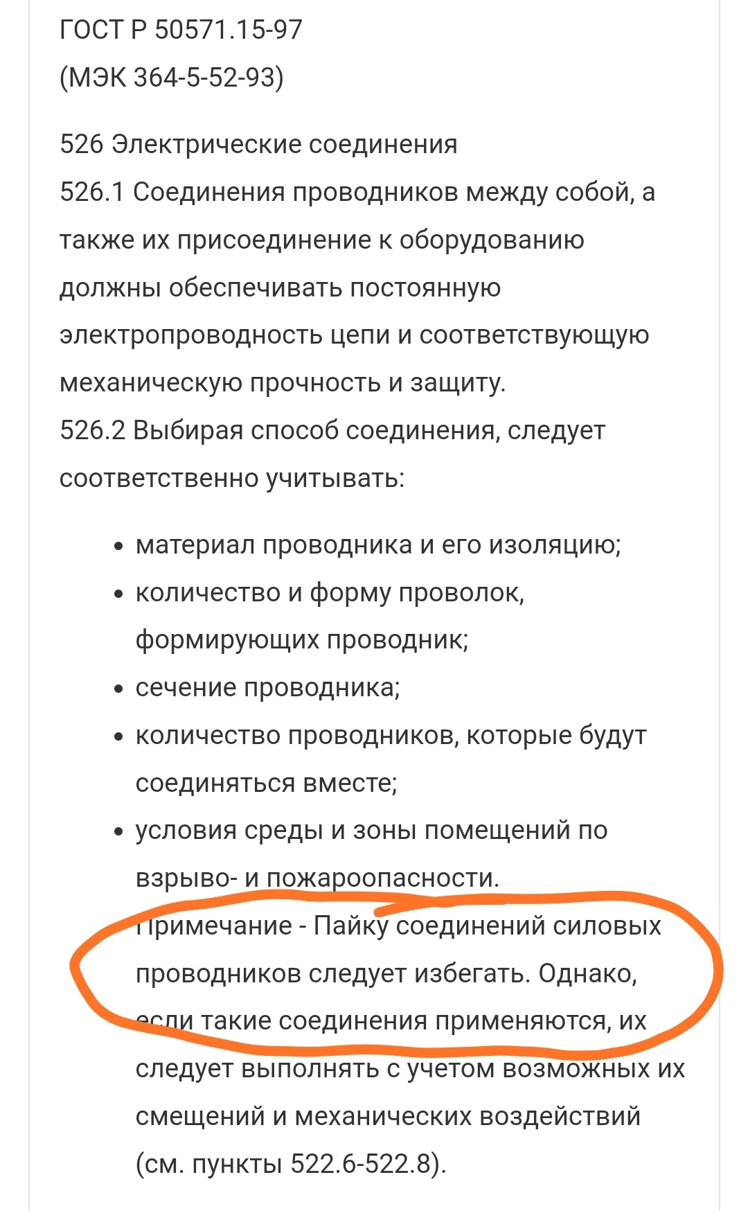 Умник, прочитай к чему относится данный гост, когда его нужно использовать, а к каким сооружениям он не относится. И даже в нем нет запрета. А во вторых при температуре плавления припоя, твоя изоляция уже давно сгорит, и всю эту линию к этому моменту использовать уже нельзя.
