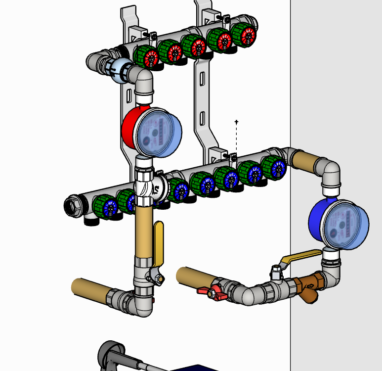 Понемногу занимаюсь проектом будущего ремонта, сегодня дошёл до узла ввода водоснабжения и его компоновки в крошечном пространстве. Изнчачально выводы труб из стены находятся на высоте ~905мм от пола, перенесу на 350мм вверх. В доме этом я родился, вопросов к качеству и давлению воды никогда не возникало, вкусная, мягкая и чистая, кран-буксы живут подолгу, поэтому от фильтров и редукторов отказался (давление на входе 3.5 - 4). Разводка от коллекторов пойдёт сшитым полиэтиленом до точек водоразбора, проточный водогрей в этом варианте подключится гибкими подводками прямо от коллекторов. Жёлтые рычажные краны - для моторов системы защиты от протечек, устанавливающихся накладным способом.