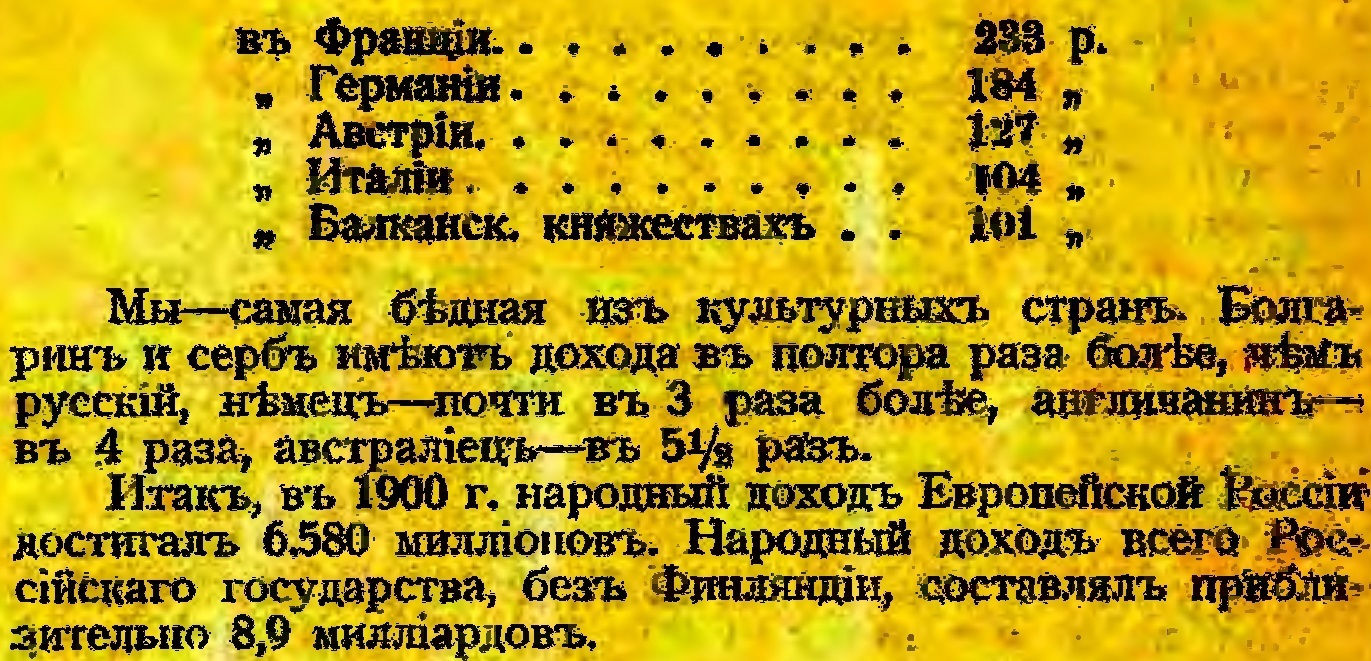 9 AV2015 8 дней назад Российская империя Серия Российская империя - Документы Народное богатство России в 1900 году ...мы видим ниже (Прокопович С.Н. Опыт исчисления народного дохода 50 губ. Европейской России в 1900-1913 гг. М.: 1918 - С. 25-26)Шестьдесят семь рублей и 25 копеек на душу населения Европейской России в 1900 г. , 5 руб 60 коп. в месяц. Российская империя История России Ещё 0