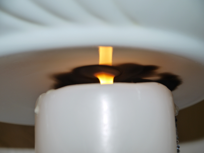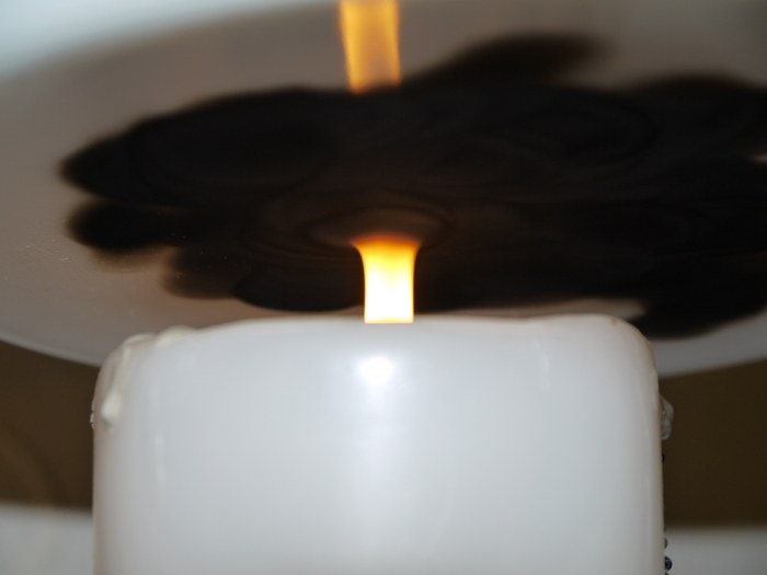 Садимся у свечи и приближаем дно нашей тарелки к пламени свечи. Тарелке ничего не будет, потому что она обожжена. Тут важно не допустить очень распространённую ошибку -- не коснуться тёплой тарелкой краёв свечи, от этого касания на тарелку попадёт воск, и размажет нашу (сажу) супер-специальный углеродный состав. А этого допускать нельзя, потому что размазав воск по оптике вы получите обратный требуемому эффект.