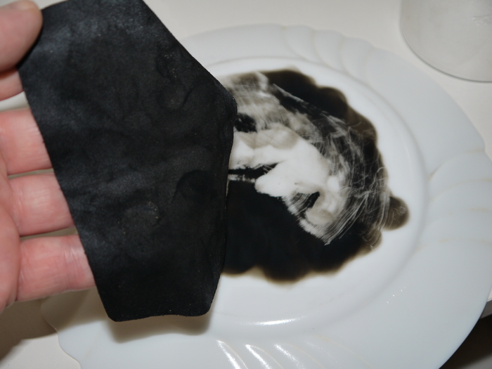 Повторяем столько раз эти манипуляции, чтобы наша тряпочка хорошенько пропиталась сажей с одной из сторон. Вторая сторона салфетки со стороны пальцев -- чистая. И на этом наше "секретное средство" готово!!!