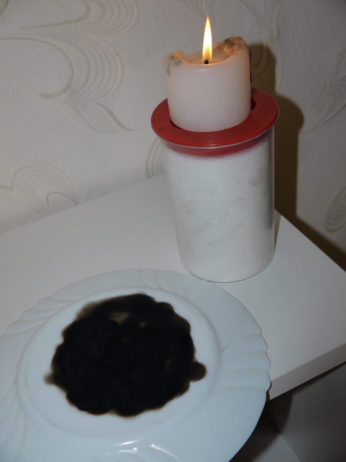 Теперь поступательными движениями проводим тарелкой над свечой и таким образом наносим нашу сажу на тарелку.