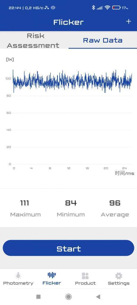 На экране отображаются осциллограммы за 40 мс. У большинства ламп пульсация имеет частоту 100 Гц, при этом на экране видны четыре волны. Если пульсация имеет более высокую частоту, количество волн на экране будет больше. Максимальная частота, которую "видит" прибор - ~800 Гц. Какой-либо фильтрации по частоте пульсации в приборе нет.
