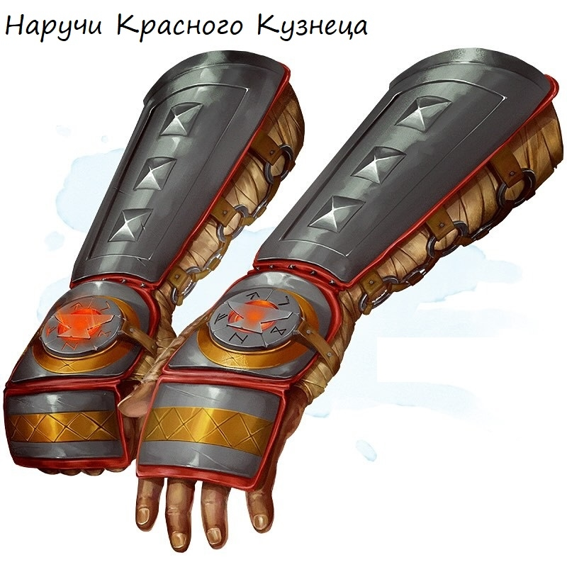 𝙍𝙚𝙙𝙨𝙢𝙞𝙩𝙝 𝙃𝙖𝙢𝙢𝙚𝙧. Нося эти наручи, вы получаете бонус +1 к броскам атаки и урона «молотом красного кузнеца», а при попадании цель получает дополнительный урон от огня 1d8. Кроме того, если вы используете «молот красного кузнеца» как часть проверки способности с инструментами кузнеца, вы можете бросить d4 и добавить выпавшее число к общему результату.