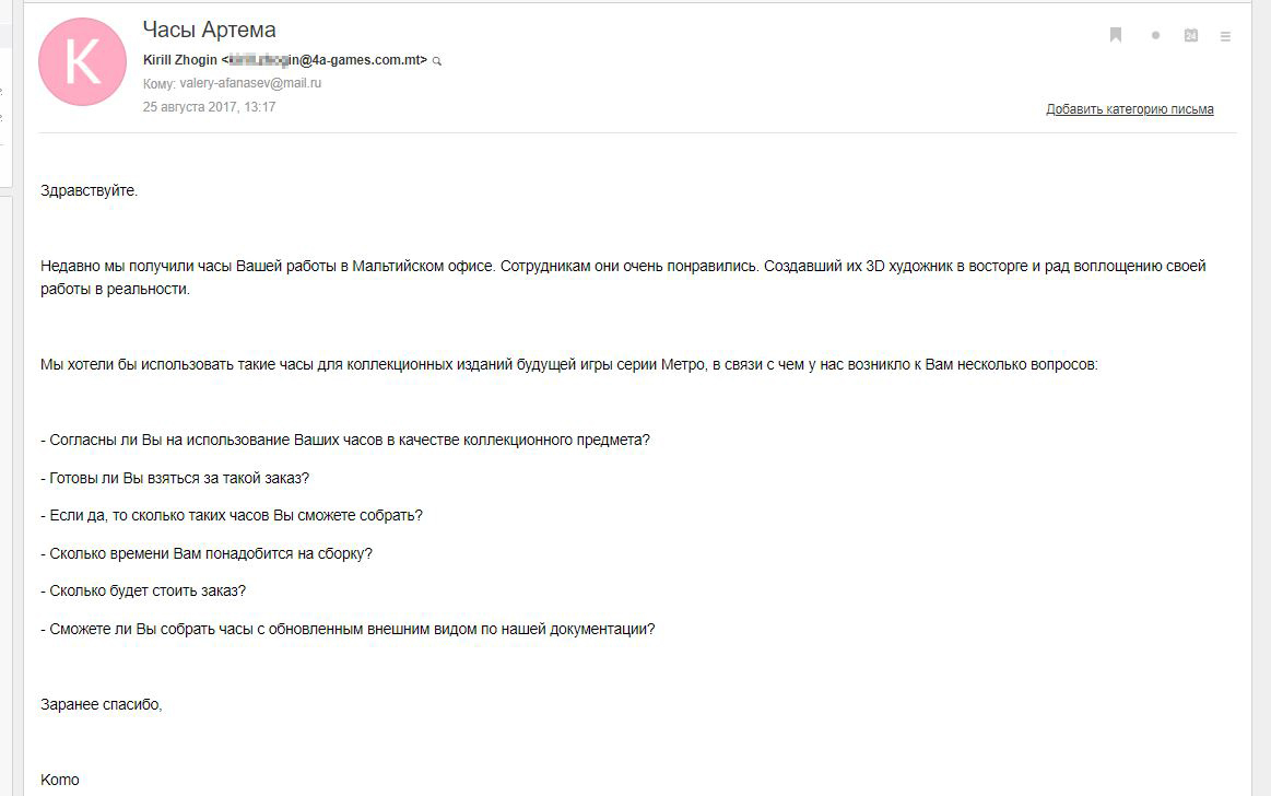Первыми представили часы авторы игры, было выпущено всего десять часов Metro Exodus Artyom Edition — все они созданы вручную и сопровождаются сертификатами подлинности, подписанными как самим писателем Дмитрием Глуховским (автор оригинальных романов), так и креативным директором 4A Games Андреем Прохоровым.
