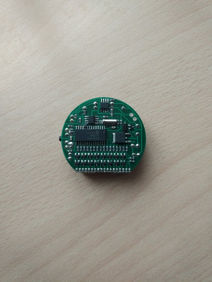 Так как изготавливать двухстороннюю плату такой сложной формы с множеством очень маленьких отверстий и узких дорожек было сложно, я стал искать альтернативы. И, как видите, нашёл: на одном форуме кто-то написал, что для себя заказал на заводе десяток плат для этих часов и лишние готов продать, вот я и купил. Остальные отличия от самодельной: транзистор в другом корпусе (такой было найти легче), термобарьер у площадок в слое питания - облегчает пайку, меньшая толщина (0,5 мм против 1,5 мм), маска.
