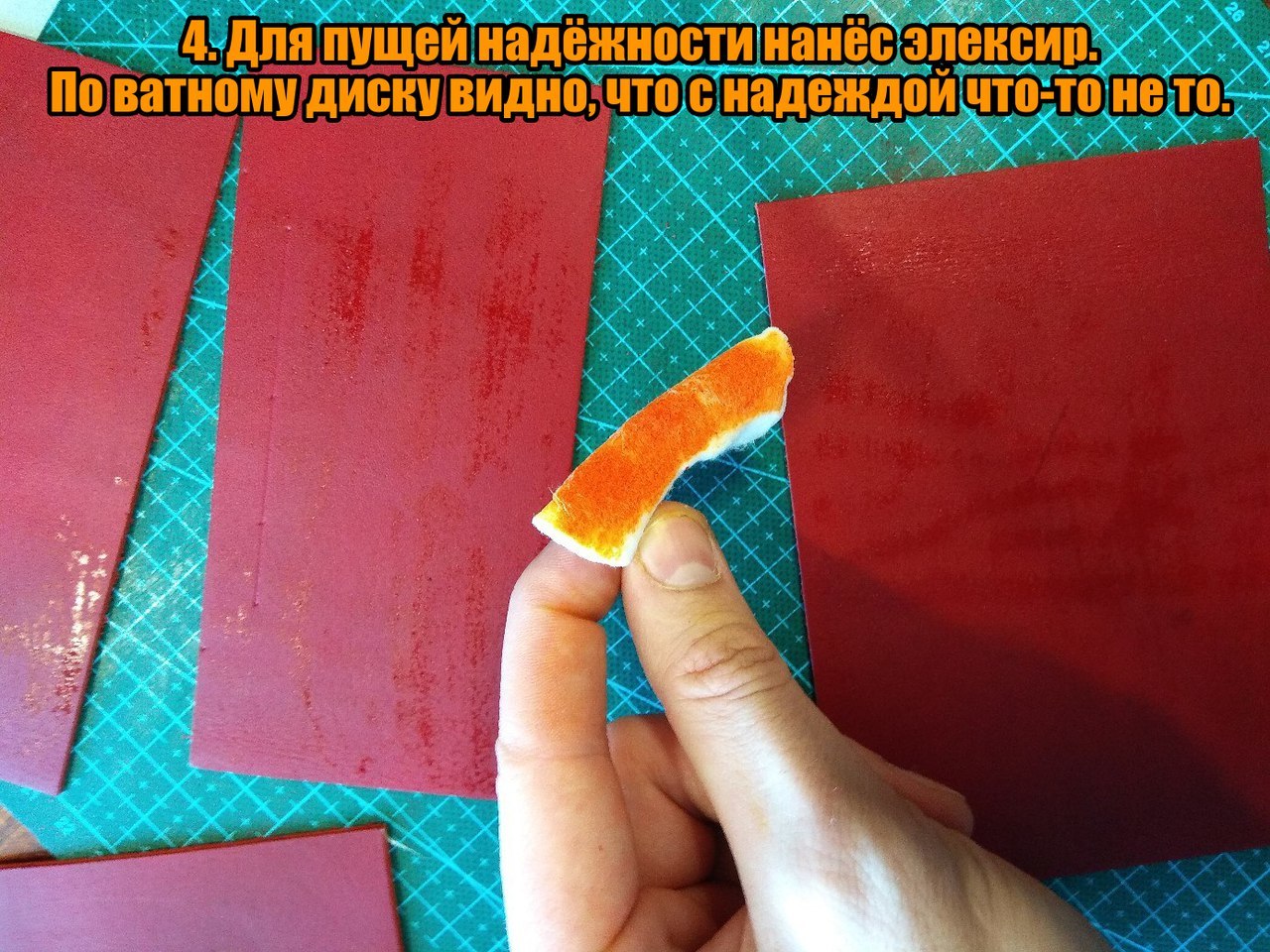 2. После того, как краска подсохла, начал насыщать жирами иссохший от спирта лоскут. Для этого было использовано льяное масло.