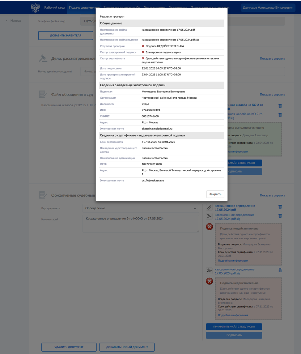 31.01.25 я подал кассационную жалобу в ЧРС через Госуслуги (заявление № 5093129192, № 77KJ0002-233-25-0000001 в ГАС «Правосудие»). Жалоба была отклонена со следующей формулировкой: «Отклонено. Электронная подпись не соответствует виду, установленному Порядком подачи документов. Усиленная квалифицированная электронная подпись не прошла проверку: на момент подписания документа срок действия сертификата электронной подписи истек, электронная подпись не соответствует документу, документ был изменен (модифицирован) после подписания его электронной подписью» (см. скриншот «Screenshot GAS UKEP»).
