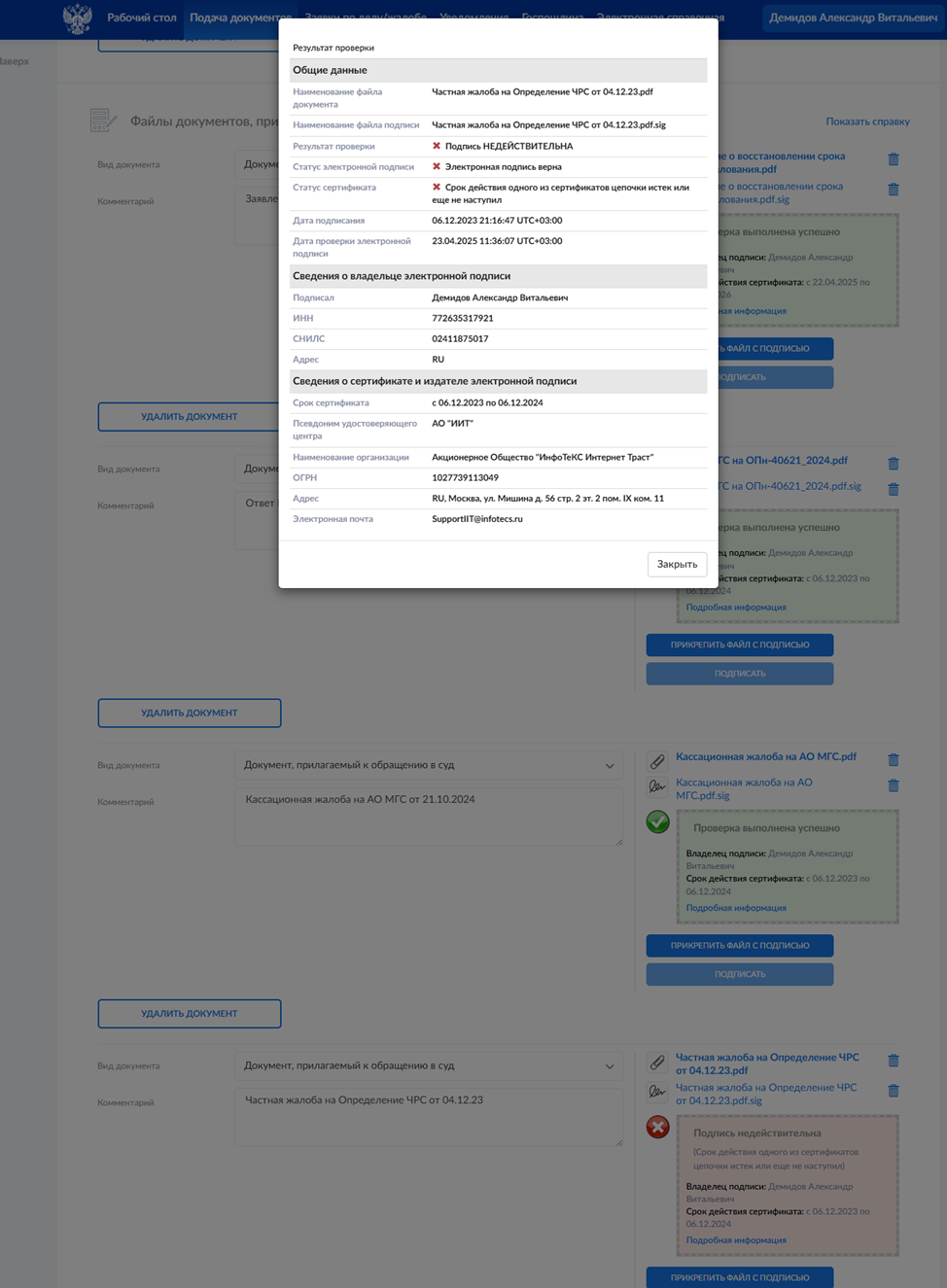 Такое отклонение жалобы, однако, является неправомерным, так как сертификат действовал на момент подписания документов в приложениях к жалобе в соответствии с меткой времени, и они таким образом являются надлежаще подписанными в соответствии с прикрепленным файлом проверки подписи для файла «Кассационная жалоба на АО МГС» (для примера) по протоколу Минцифры (на https://e-trust.gosuslugi.ru/check/sign) с соответствующим файлом открепленной УКЭП (https://cloud.mail.ru/public/PCxg/ppi5QyEtA) (см. файл «Отчет о проверке эл. подписи»). Это будет продемонстрировано и на примере файла проверки в ГАС «Правосудие» ниже.