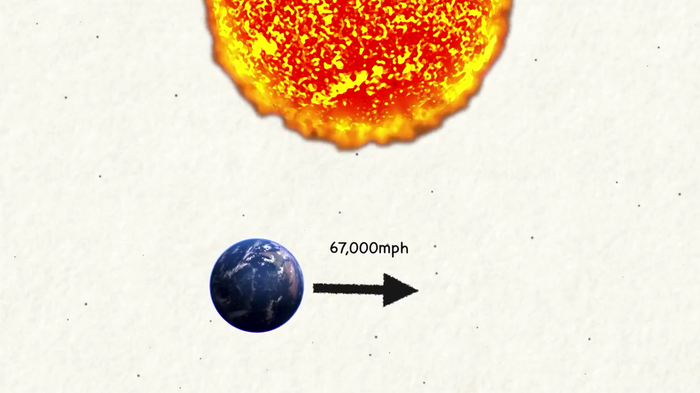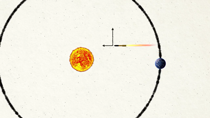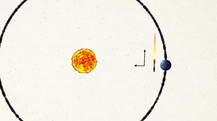 Чтобы попасть на Солнце нам нужно полностью погасить эту самую sideways speed, для этого нам нужно запустить ракету в сторону ПРОТИВОПОЛОЖНОЙ движения Земли вокруг Солнца с ТАКОЙ ЖЕ скоростью, с которой Земля вращается вокруг Солнца (30 км/с):