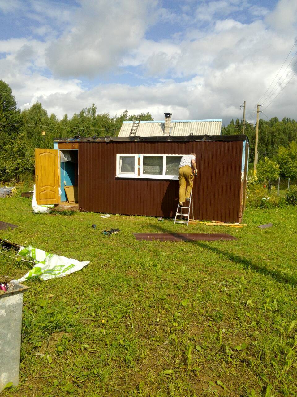 Окна и двери покупали б/у. Далее отделка металлом и внутренняя отделка.
