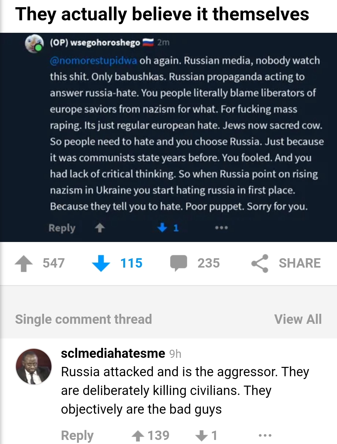 "Вот опять. Российские сми. Никто не смотрит это г-но. Только бабушки. Российская пропаганда отвечает на "раша хейт" Вы люди, виноватите освободителей и спасителей европы от нацизма, за что? За еб-чие массовые изнасилования. Теперь когда евреи священная корова. Вам по прежнему нужна ненависть, и вы выбрали Россию. Просто потому что это была советская страна. Вы одурачены, и у вас недостаток критического мышления. И когда Россия указала на растущий нацизм на Украине. Вы начали ненавидеть Россию. Потому что вам сказали. Жалкая марионетка. Мне жаль вас."