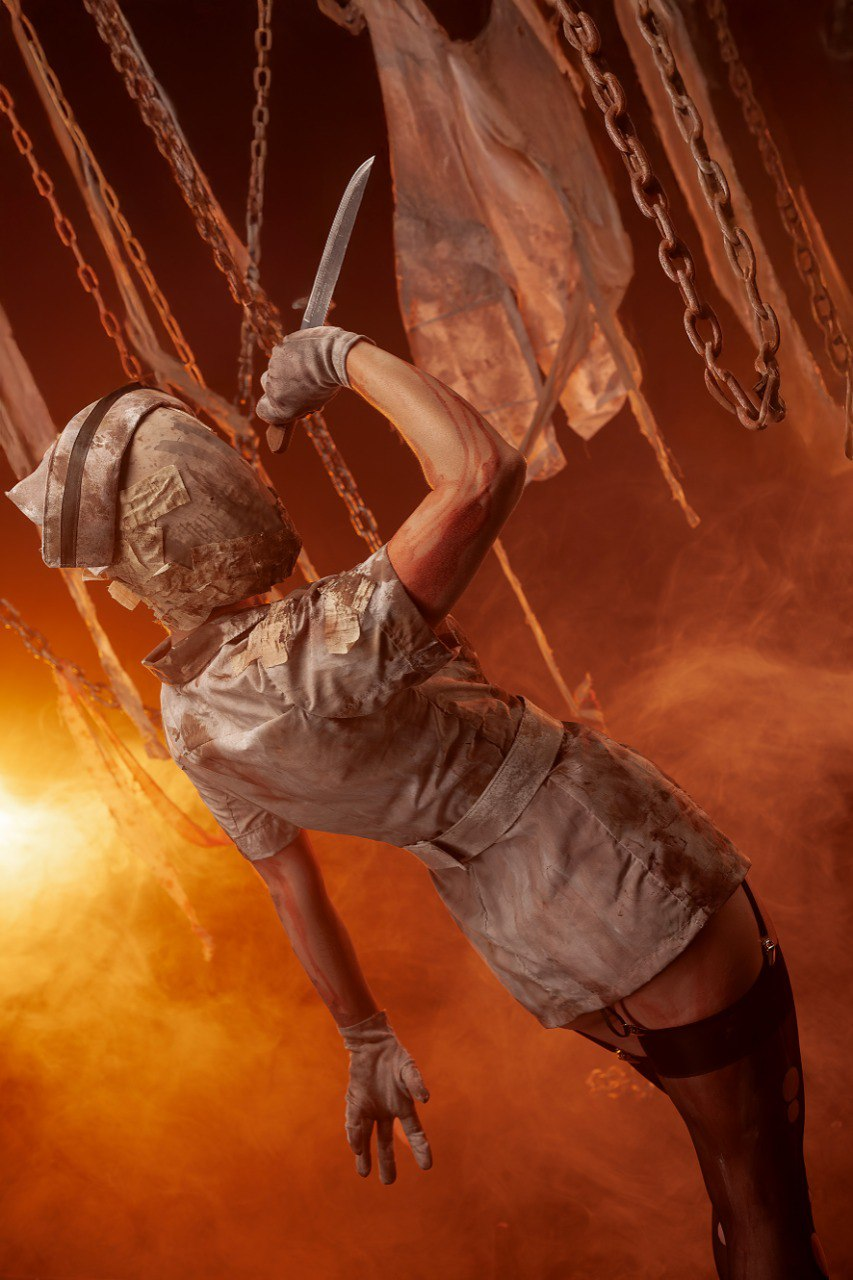 Юля сделала костюм медсестры за неделю. На роль пирамидхэда мы позвали чемпиона Поволжья по бодибилдингу.