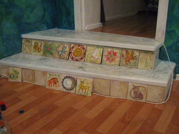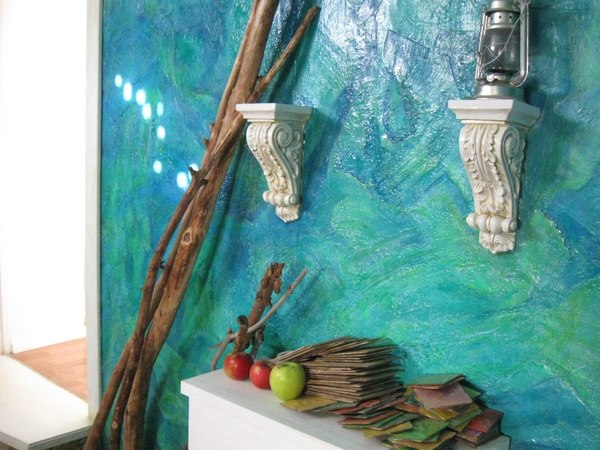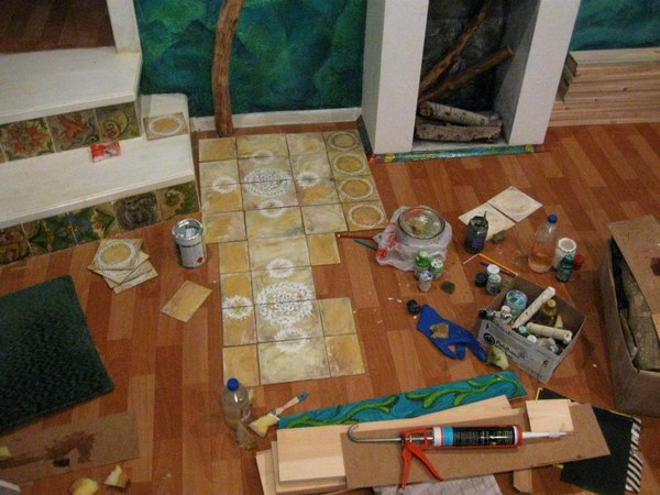 У нас было 2 банки яхтного лака, 10 литров белой водоэмульсионки, 5 бронзовых маркеров, несколько пакетиков бирюзовых блесток и бесконечное множество баночек художественной краски всех сортов и расцветок, а также шпаклевка, зеркала, лист хдф, пол литра ярких колеров и строительный клей.