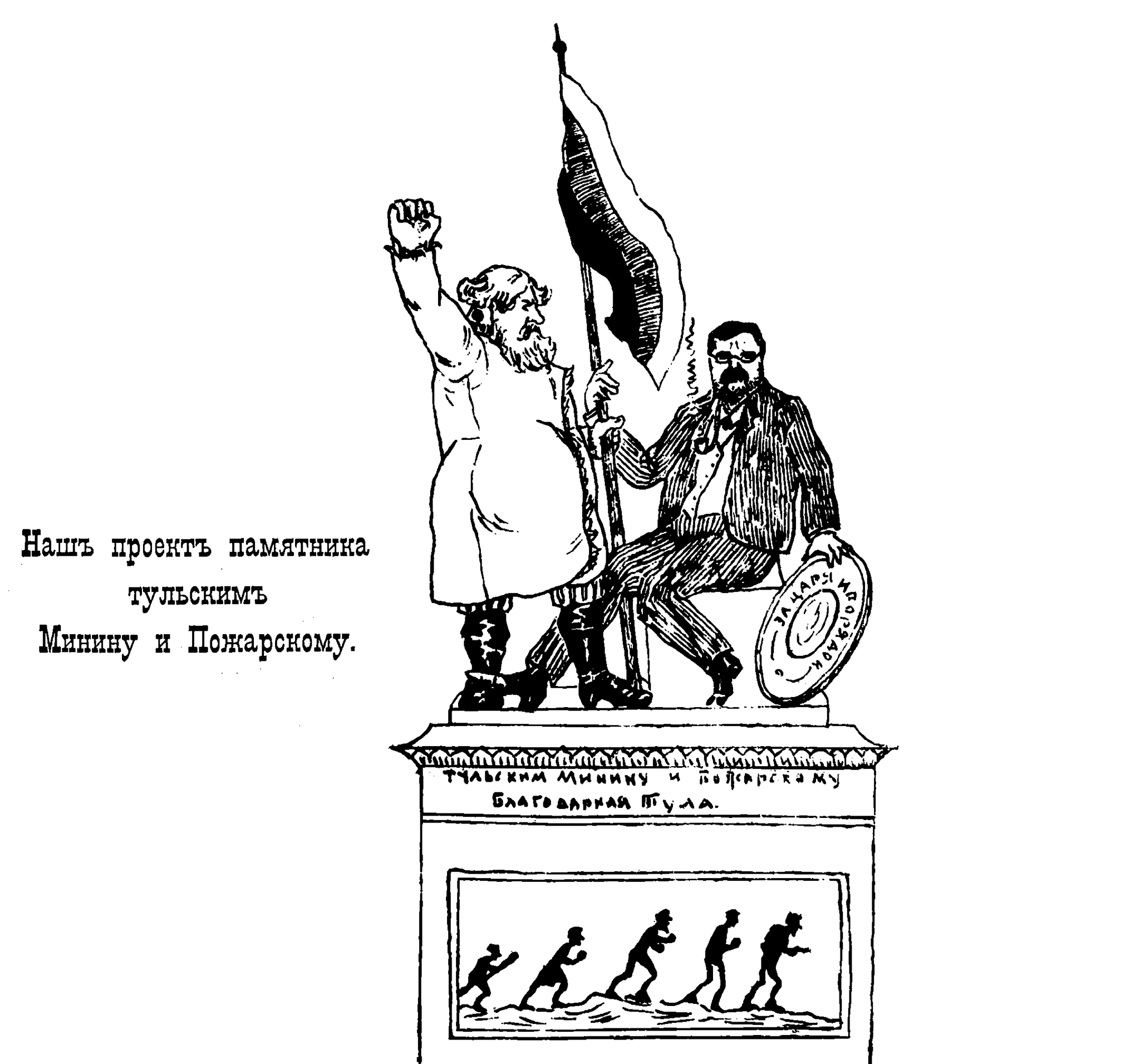 7 molva.press Карикатуры и шаржи Юмор Наш проект памятника тульским Минину и Пожарскому Серия Сатира и юмор из дореволюционных газет 1 год назад «Тульская газета», № 10, 1906 г. Из корреспонденции: „ ... Наибольшей популярностью пользуются в Туле: булочник Иван Парменых Колоколин, которого у нас называют тульским Мининым, и гр. В. А. Бобринский, именуемый князем Пожарским...“ [моё] Краеведение Российская империя Старая газета 1906 Карикатура Сатира Юмор Иллюстрации Гравюра Минин и Пожарский Тула Ещё 0