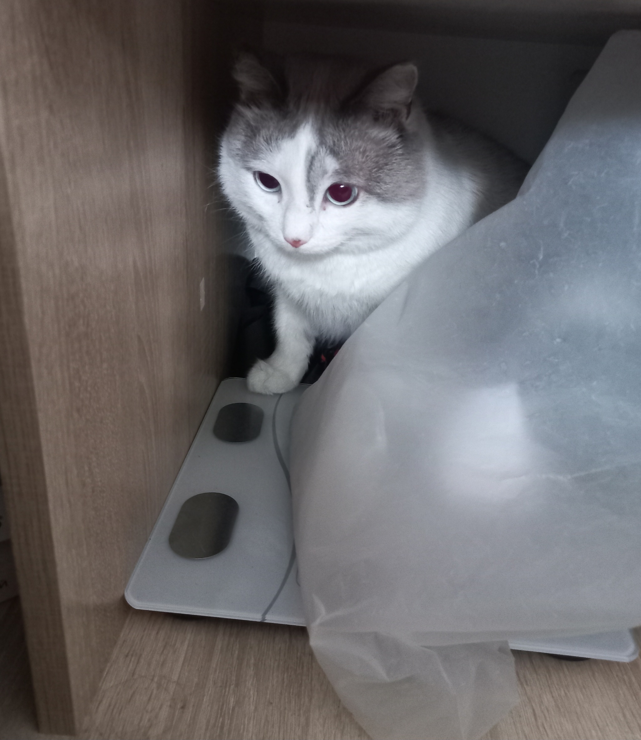 Самое страшное для него - пылесос. Прячется и выдаёт жалобное гортанное "МАУ!". Прячется от робота-убийцы.