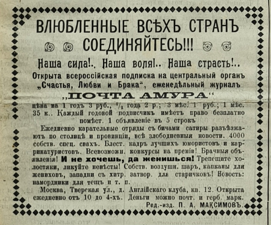 Открыта всероссийская подписка на центральный орган „Счастья, Любви и Брака“, еженедельный журнал „Почта Амура“.