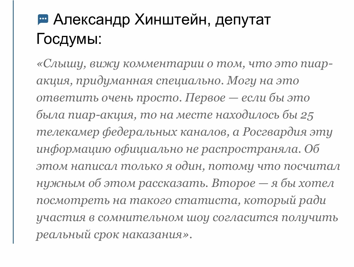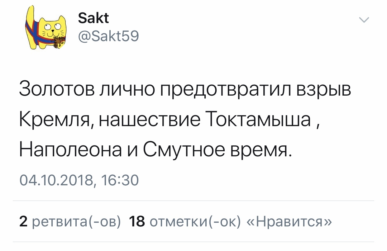 Наверное, бессмысленно пытаться расследовать произошедшее на Васильевском спуске. Что это все-таки было — пиар-акция или подвиг главы Росгвардии. Кстати говоря, высокий чиновник не имеет права без весомого повода, подвергать свою жизнь опасности. Хотя бы потому, что он отвечает не только за себя, но и за вверенное ему ведомство, которое к тому же является силовым и отвечает за безопасность государства. Для переговоров с террористами или психически больными есть специальные службы, которые за это непосредственно отвечают и получают зарплату. Если же считать, что это была пиар-акция, то она была подготовлена не лучшим образом, и вместо улучшения имиджи Золотова может возыметь обратный эффект.