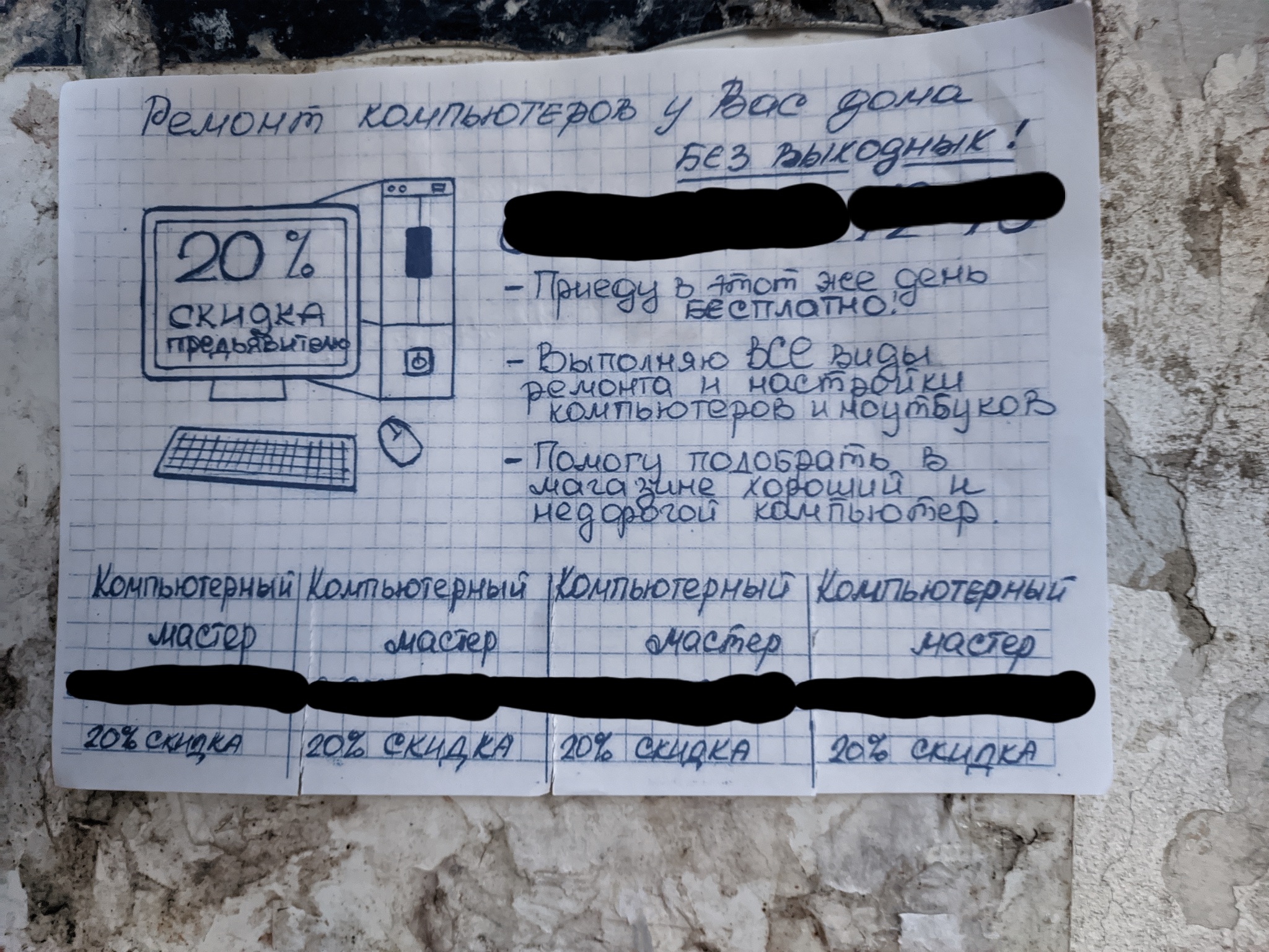 Lev72rus 5 лет назад Наше время Странный компьютерный мастер... Объявление от руки...Фото сделано мной, тег моё [моё] Ремонт компьютеров Рукопись Ещё 0