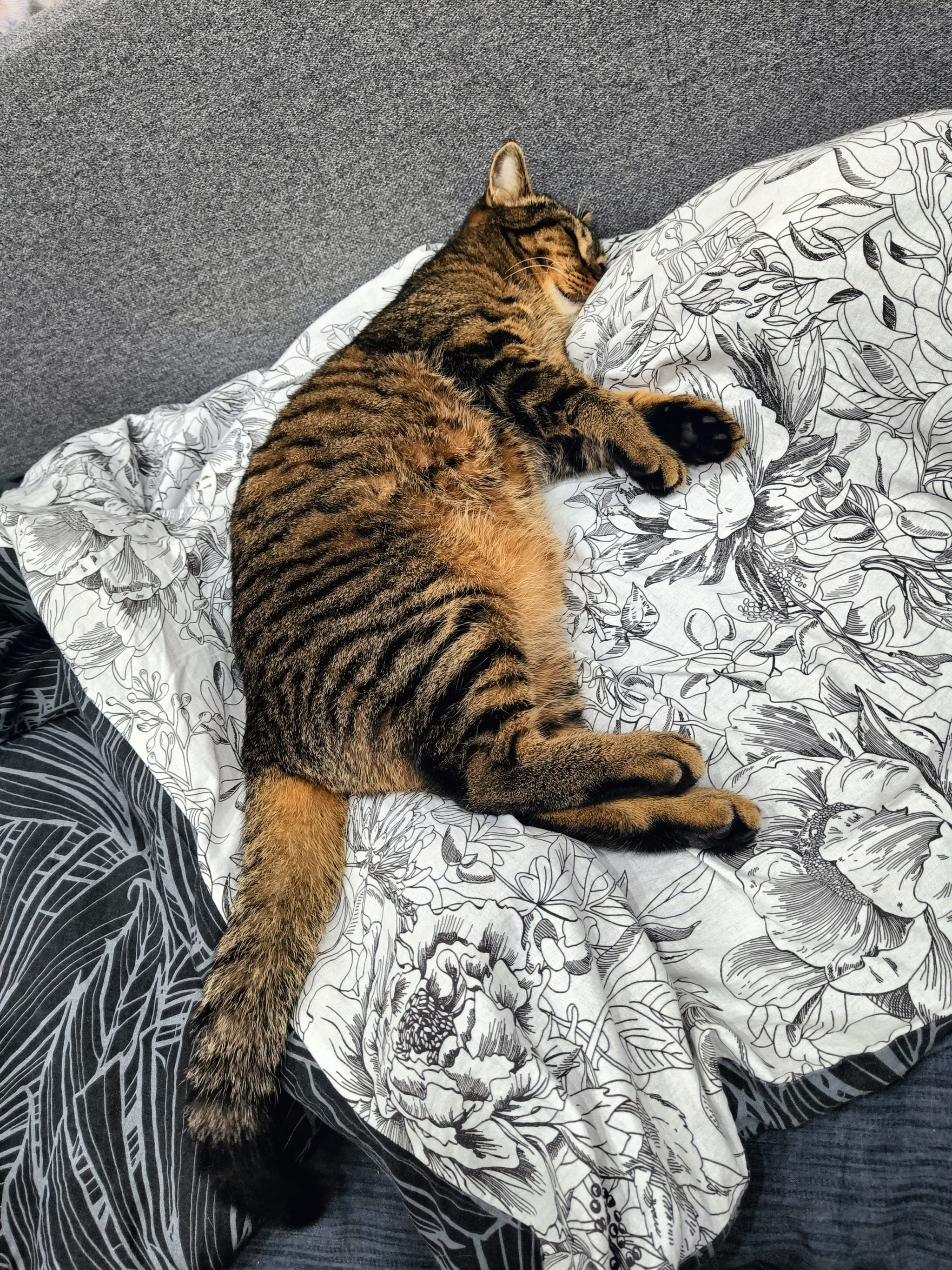 Обошли соседей, поспрашивали, повешали обьяву о нашедшемся коте на станции. Никто не откликнулся. В прошлые выходные родителей вывозили домой в город, кота забрали тоже. Сразу в ветеринарку: молодой кот 1-1,5 года, 3 кг-худосочный, блох нет, что удивительно. Других кожных болячек тоже. Проглистовали, простерилили. Отмыли. Парень наголодался, сейчас отьедается. Порода-классический сибиряк/норвежский лесной) интелегентный, с тихим мявом.