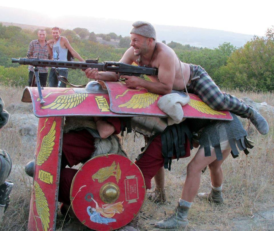 Больше глупости данной сцене придает это: "А через день (как это обычно и бывает) была съемка уже другого боя, где все наши римляне должны были уже быть чистыми, поэтому наш департамент работал круглосуточно, сменяя друг друга, чтобы успеть отмыть - отчистить - просушить все костюмы."