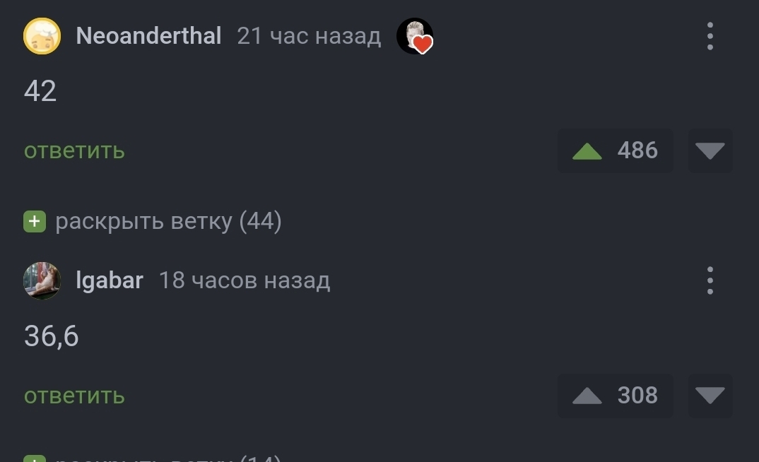 Забавно, что 36.6 - это нормальная температура, а 42 - при которой свёртывается белок. Есть версия, что в той книге/фильме такой ответ от супер компьютера связан именно с этим