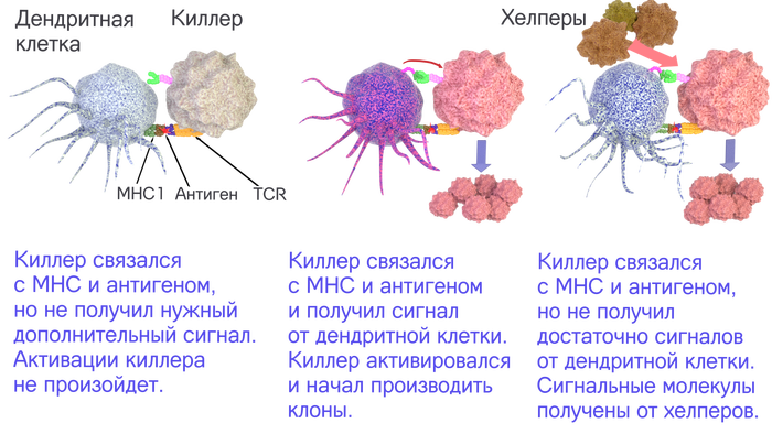 Т-киллеры, связавшиеся с дендритной клеткой, активируются после помощи Т-хелперов.