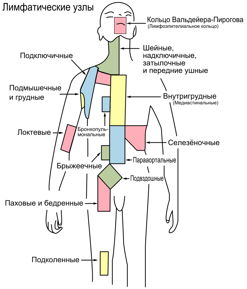 Наши лимфоцитарные бойцы распределяются по разным военным частям. Одна из таких частей представлена лимфатическими узлами. Эти небольшие скопления лимфоидной ткани раскиданы по всему организму. Сюда поступают зрелые, но наивные Т- и В-лимфоциты. Именно здесь, в лимфоузле, они готовятся исполнить свое предназначение. Через лимфоузел проходит лимфа, которая омывает ближайшие ткани и захватывает всё подозрительное, что там есть. Основные регионы скопления лимфатических узлов представлены на картинке ниже.