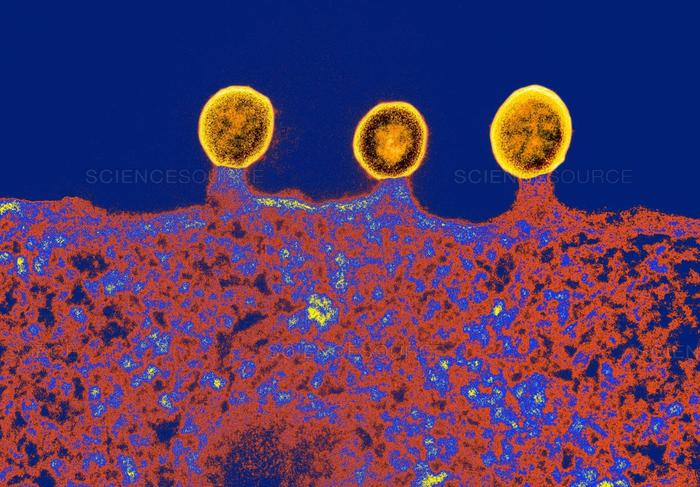 Вирусы иммунодефицита человека (желтые) на поверхности хелпера.