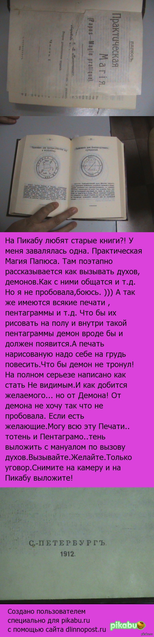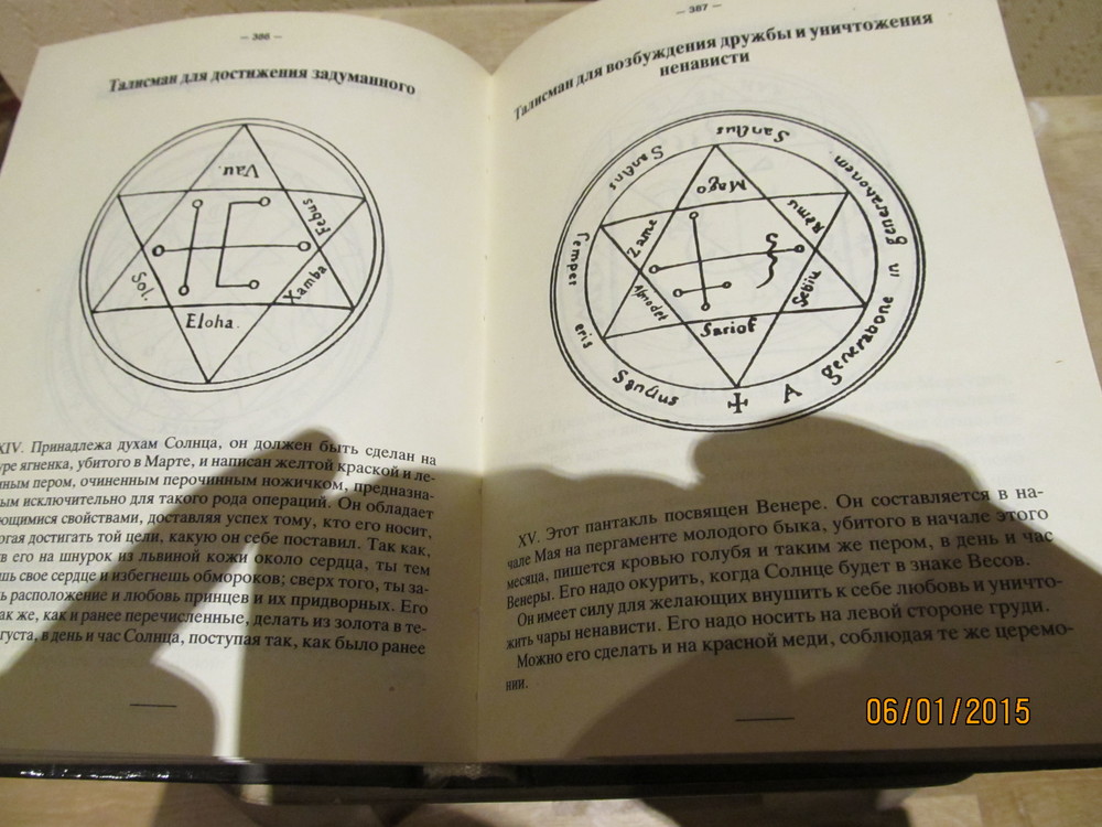 Была у меня такая книга, только купил в магазине. Молодой был, думал - а вдруг это работает. Но дальше чтения не пошло, как сейчас помню один из ингридиентов для вызова бури - шкура дрозда. И так всю книгу: возьмите перо с жопы игуаны, нарисуйте пентуху, растолчите в пыль, смешайте, вылейте в чашу, спуститесь в подвал вашего фамильного замка и приступите к ночному бдению, глядя в воду и не моргая. Перед этим рекомендуется не принимать мяса минимум 30 дней, поэтому заранее сообщите об изменениях вашего рациона слугам.