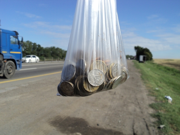 Миновал казачий рынок, еду себе неспеша дальше в сторону Шахт. И тут на обочине вижу целую россыпь монет, да не какую-то медь по 10-50 копеек, а полновесные червонцы и пятирублёвики: