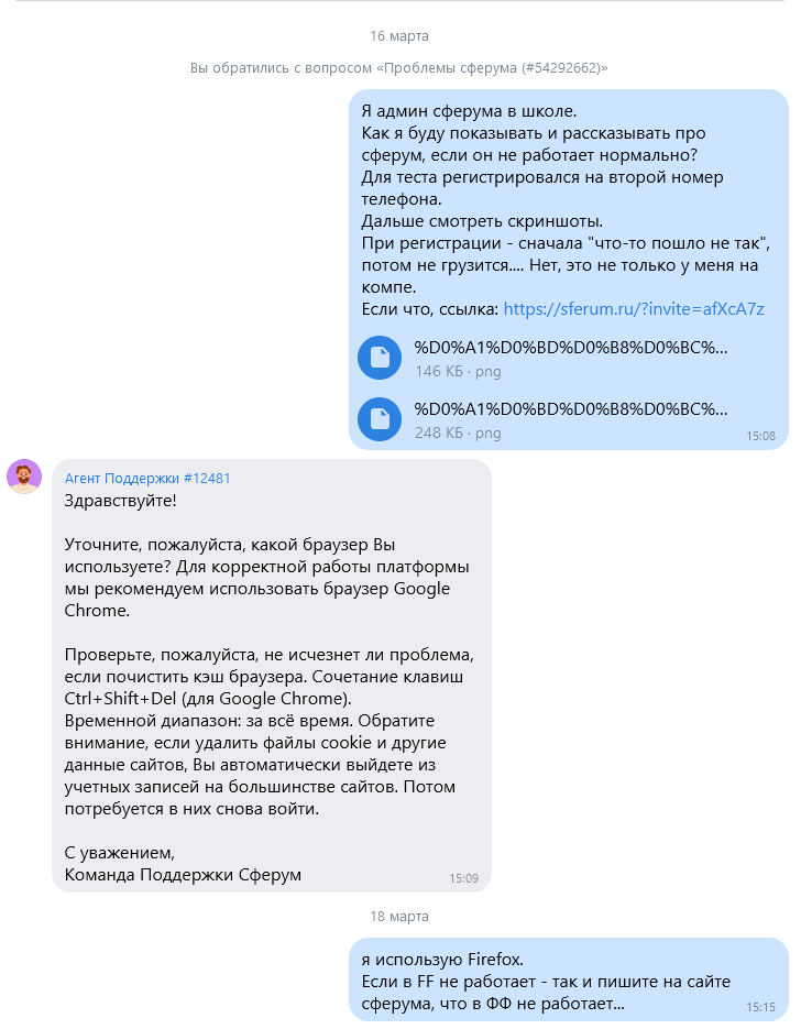 А теперь о самом качестве Сферума: (да, мне очень стыдно за мой стиль общения с ТП сферума, но бомбит же!)